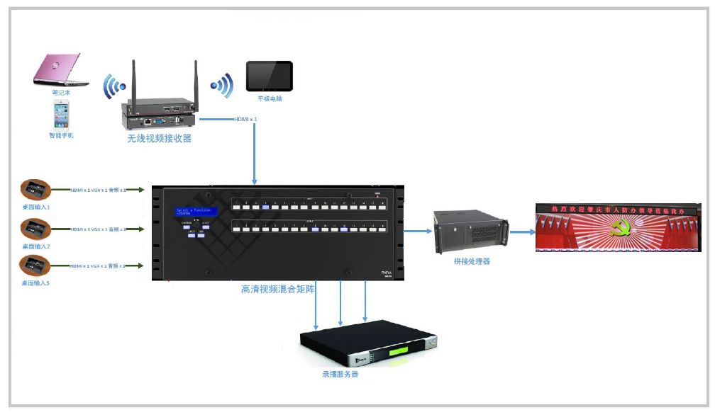 ? 拼接屏顯示的內(nèi)容為來(lái)自會(huì)議室內(nèi)/外的信號(hào)輸入源,顯示信號(hào)內(nèi)容包括: